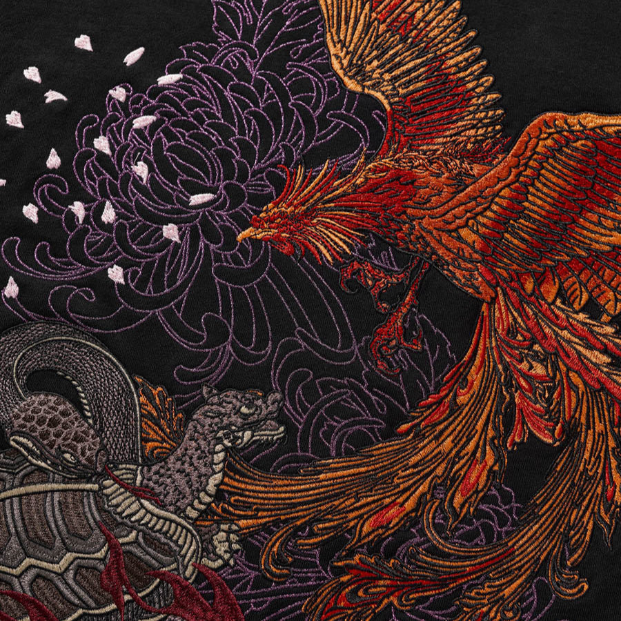 Step into legend with the Celestial Guardians Hoodie, a tribute to the four divine guardians of East Asian mythology. The Phoenix (Suzaku), Dragon (Seiryu), White Tiger (Byakko), and Black Tortoise (Genbu) are intricately embroidered across the garment, each symbolizing balance, protection, and cosmic strength. Together, they embody harmony between heaven and earth.